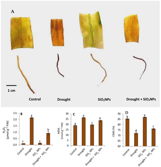 The results in Figure 6A,B show that the content of H2O2 in maize seedlings has significantly increased under drought conditions compared with seedlings grown under normal irrigation conditions. In addition, the treatment with SiO2NPs did not affect the H2O2 content of the seedlings under normal irrigation conditions. On the other hand, a discernible beneficial impact was observed in mitigating the concentration of hydrogen peroxide (H2O2) in plants treated with silicon dioxide nanoparticles (SiO2NPs) during instances of water stress. The results in Figure 6C indicate that the malondialdehyde (MDA) content in maize seedlings increased when seedlings were subjected to drought conditions compared to normal irrigation conditions. Furthermore, the application of SiO2 nanoparticles resulted in a noteworthy reduction in malondialdehyde levels in comparison to non-treated vegetation exposed to drought conditions. As expected, the percentage of CMSI decreased in maize seedlings grown under normal irrigation conditions compared to those under drought stress Figure 6D. The SiO2NPs application increased the percentage of CMSI under both water conditions.