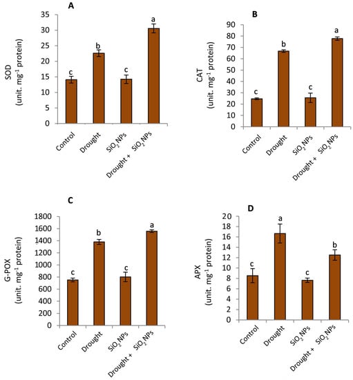 Effect of applied SiO2NPs on activities of (A) superoxide dismutase SOD, (B) catalase CAT, (C) peroxidase POX, and (D) ascorbate peroxidase APX of maize seedlings under normal irrigation and drought stress. The data that have been presented with a ±SD notation represent the mean values of three separate replicates. Significant variations were observed based on Duncan’s multiple range test at a significance level of p ≤ 0.05, as indicated by the distinct lowercase letters.