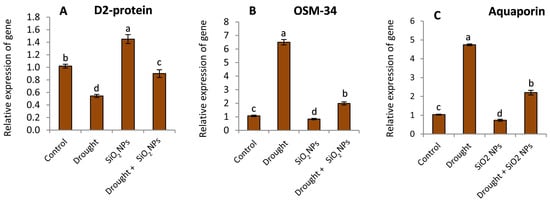 The results in Figure 8A indicate that expression of the D2 protein gene decreased under drought stress compared with regular irrigation. Moreover, the D2 protein expression was increased by SiO2 NPs application under drought conditions, while the D2 protein gene was significantly increased under normal water conditions. The expressions of both OSM-34 and aquaporin genes were found to be upregulated in response to drought stress compared to well-watered conditions (Figure 8B,C). Moreover, the treatment with NPsSiO2 led to a decrease in the expression of OSM-34 and Aquaporin genes under drought and normal conditions compared to the untreated plants.