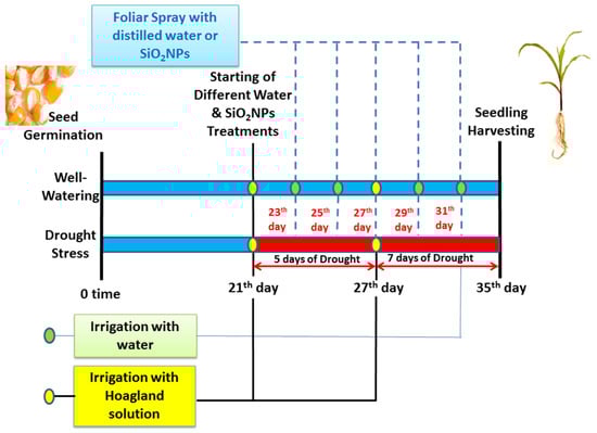 A simplified model shows the different treatments (irrigation and foliar applications with distilled water or SiO2NPs) and the sampling date of maize seedlings.
