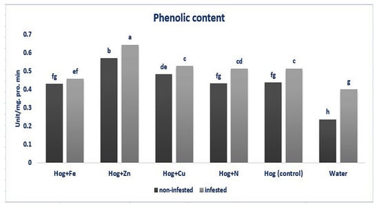Phenolic content in wheat plants treated with Fe, Zn, Cu, N, Hoagland (control), and water under Schizaphis graminum-infested and non-infested conditions. Different letters demonstrated significant differences at p = 0.05.