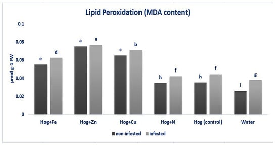 Rate of malondialdehyde (MDA) in wheat plants treated with Fe, Zn, Cu, N, Hoagland (control), and water under Schizaphis graminum-infested and non-infested conditions. Different letters demonstrated significant differences at p = 0.05.