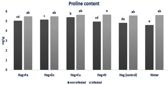 Amount of proline content in wheat plants treated with Fe, Zn, Cu, N, Hoagland (control), and water under Schizaphis graminum-infested and non-infested conditions. Different letters demonstrated significant differences at p = 0.05.
