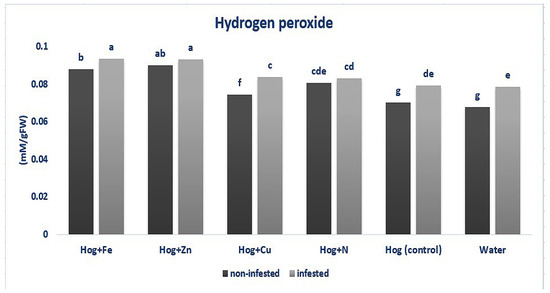 Amount of hydrogen peroxide in wheat plants treated with Fe, Zn, Cu, N, Hoagland (control), and water under Schizaphis graminum-infested and non-infested conditions. Different letters demonstrated significant differences at p = 0.05.