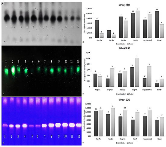 Native-PAGE (polyacrylamide gel electrophoresis) analysis of peroxidase (POX) (A,B), catalase (CAT) (C,D), and superoxide dismutase (SOD) (E,F) activities in wheat plants treated with Fe, Zn, Cu, N, Hoagland (control), and water under Schizaphis graminum-infested and non-infested conditions. Note: 1, 3, 5, 7, 9, 11 identifying N, nano-Cu, water, Hoagland (control), nano-Fe, nano-Zn treatments under non-infested condition, respectively; 2, 4, 6, 8, 10, 12 identifying N, nano-Cu, water, Hoagland, nano-Fe, nano-Zn treatments under aphid-infested, respectively. Different letters demonstrated significant differences at p = 0.05.