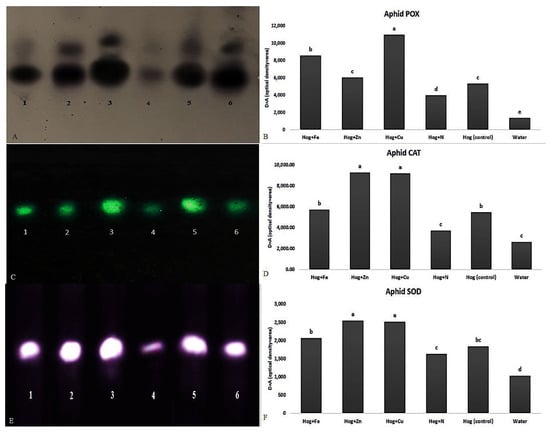 Native-PAGE (polyacrylamide gel electrophoresis) analysis of peroxidase (POX) (A,B), catalase (CAT) (C,D), and superoxide dismutase (SOD) (E,F) activities in Schizaphis graminum reared on wheat plants treated with Fe, Zn, Cu, N, Hoagland (control), and water. Note: 1, 2, 3, 4, 5, and 6 identifying the enzymatic activities of S. graminum reared on wheat plants treated with N, Hoagland (control), nano-Cu, water, nano-Zn, and nano-Fe, respectively. Different letters demonstrated significant differences at p = 0.05.