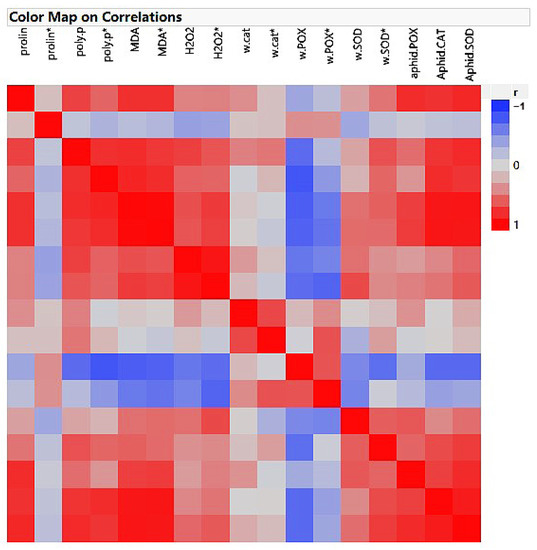Concerning the heatmap data in the infested and treated plants, phenolic compounds displayed 80, 57, 80, 55, 81, and 76% correlations with the MDA, H2O2, POX, SOD, aphid CAT, and SOD, respectively. MDA showed 71, 64, 53, 73, 92, and 90% correlations with H2O2, POX, SOD, aphid POX, CAT, and SOD, respectively. H2O2 had 73, 60, and 50% associations with wheat POX, SOD, and aphid CAT, respectively (Figure 7).