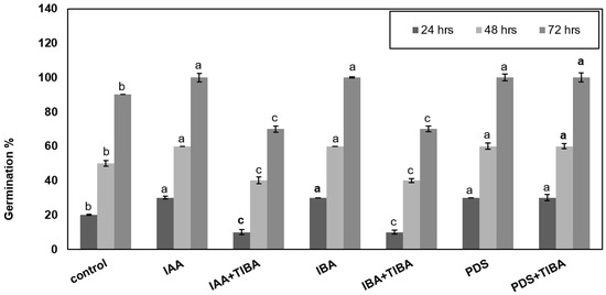 Maize seeds were treated exogenously with different treatments, i.e., IAA, IBA, and PDS alone and in combination with TIBA, while seeds were also treated with distilled water as a control treatment. The results show that control seeds displayed 20% germination after 24 h, 50% after 48 h, and 90% after 72 h. Seeds treated with IAA, IBA, and PDS alone showed 60% germination after 48 h and 100% after 72 h. Importantly, the application of IAA + TIBA caused a noticeable reduction in the germination rate, being 10% after 24 h, 48% after 48 h, and 70% after 72 h. Similarly, treatment with IBA + TIBA resulted in a germination rate of 8% after 24 h 45% after 48 h and 70% after 72 h. Seeds treated with PDS + TIBA displayed a remarkable increase in germination as compared to IAA + TIBA and IBA + TIBA, while the increase percentage was similar to that for the individual application of PDS, IAA and IBA (Figure 1).