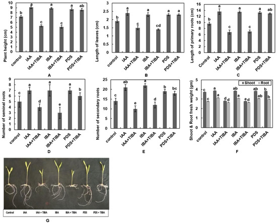 Effect of IAA, IBA, TIBA, and PDS solution on plant height and length of leaves. (A) Maize seeds were subjected to the control, IAA, IAA + TIBA, IBA, IBA + TIBA, PDS, and PDS + TIBA. Plant height and length of leaves were observed after 10 days. IAA, IBA, PDS, and PDS + TIBA significantly enhance plant height, (B) the length of leaves, (C) the length of primary roots, (D) the number of seminal roots, (E) the number of secondary roots, and (F) shoot and root fresh weight, and (G) a photograph was taken after 10 days. The X-axis represents various treatments. All of the data were analyzed by using one-way ANOVA, with multiple comparisons using the LSD test at a significance threshold of p ≤ 0.05 (n = 10). Different letters on graph bars indicate significant differences among different treatments. Each independent experiment was repeated three times.