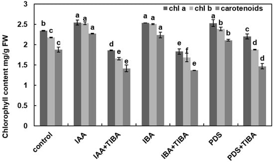 Effect of IAA, IBA, TIBA, and PDS solution on chlorophyll pigments and carotenoid contents of maize. Chlorophyll contents and carotenoid contents were observed on day 10 after cultivation. The chlorophyll and carotenoids contents were measured by randomly selecting 3 plants from each treatment. The x-axis represents different treatments. All of the data were analyzed by using one-way ANOVA, with multiple comparisons using the LSD test at a significance threshold of p ≤ 0.05 (n = 3). Different letters on graph bars indicate significant differences among different treatments. Each independent experiment was repeated three times.