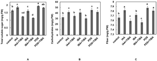 Effect of IAA, IBA, TIBA, and PDS solution on total soluble proteins and total soluble sugars of maize. (A) Total soluble sugars were observed and measured by randomly selecting 5 plants from each treatment. (B) Carbohydrate and (C) fiber contents were observed and measured by selecting 10 plants randomly from each treatment. All of the data were analyzed by using one-way ANOVA, with multiple comparisons using the LSD test at a significance threshold of p ≤ 0.05 (n = 10). Different letters on graph bars indicate significant differences among different treatments. Each independent experiment was repeated three times.