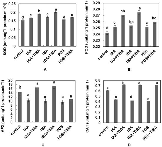 Effect of IAA, IBA, TIBA, and PDS solution on SOD, POD, APX, and CAT activity in maize. (A) SOD, (B) POD, (C) APX, and (D) CAT activities were observed and measured by randomly selecting 10 plants from each treatment. All of the data were analyzed by using one-way ANOVA, with multiple comparisons using the LSD test at a significance threshold of p ≤ 0.05 (n = 10). Different letters on graph bars indicate significant differences among different treatments. Each independent experiment was repeated three times.