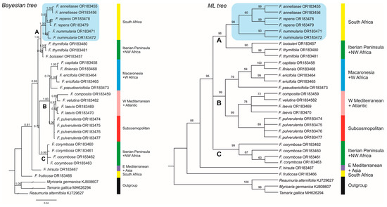 Species of Frankenia are arranged in three strongly supported main groups, though not fully resolved. First, clade A (1.00 PP, 96 BP) contains the South African members related to F. nodiflora nested in a strongly supported clade (1.00 PP, 98 BP), together with F. repens. This three-species group (hereafter the “F. repens group”) includes three well to strongly supported lineages that correspond to the newly described F. nummularia (1.00 PP, 90 BP) and F. anneliseae (1.00 PP, 99 BP) plus F. repens (1.00 PP, 99 BP). This clade is sister (0.99 PP, 90 BP) to a group including the E Iberian–W Algerian endemic F. thymifolia (1.00 PP, 96 BP) plus the SW Iberian–NW Moroccan endemic F. boissieri Reut. ex Boiss. Second, clade B (1.00 PP, 99 BP) includes taxa with a broad Mediterranean, Macaronesian, Atlantic, or Subcosmopolitan distributions. It is weakly supported as sister to clade C in the BI tree (0.77 PP), but its position is not resolved in the ML tree. Two subclades are recovered in our analyses. On the one hand, a moderately supported subclade (0.74 PP, 79 BP) groups the Macaronesian and Western Saharan endemics of the genus. The Canarian F. ericifolia C.Sm. ex DC. (1.00 PP, 99 BP) is weakly sister in the ML tree (59 BP) to a strongly supported group (1.00 PP, 100 BP), also including the Canarian F. capitata plus the W Saharan F. ifniensis Caball., a relationship not recovered in the BI tree. The Cape Verdean endemic F. pseudoericifolia Rivas Mart. & al. is sister to the members of this subclade only in the ML tree (0.79 BP), but its position is unresolved in the BI tree. On the other hand, a strongly supported subclade (1.00 PP, 99 BP) includes samples of the annual F. pulverulenta from South Africa, the Canary Islands, and the Iberian Peninsula that form in the ML analysis a moderately supported clade (89 BP), which in the ML tree is moderately supported (78 BP) as sister to a clade that includes western Mediterranean–Atlantic (F. laevis L. and F. composita Pau and Font Quer) and northwestern Atlantic Moroccan (F. velutina Brouss. ex DC.) members of the genus. Finally, clade C (0.99 PP, 99 BP) is formed by accessions of F. corymbosa Desf. from SE Iberian Peninsula and N Morocco, though the internal relationships of this clade are very weak and are not connected with a geographical provenance of samples. The eastern Mediterranean species F. hirsuta L. (s.l.) and the outstanding South African narrow endemic, F. fruticosa, are successive sisters to the rest of the studied taxa (clade A + B + C), relationships that are in need of further investigation.