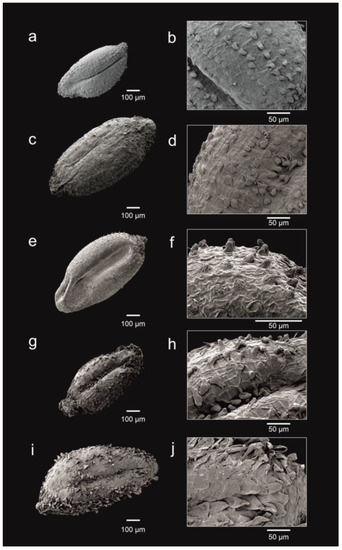 When available, at least 10 mature seeds of several individuals from at least three populations of the studied species (Table 1) were observed in detail for morphological characterisation. Seeds were taken from both living plants and herbarium sheets, and when possible, they were rehydrated for more accurate observations. Scanning Electron Microscope (SEM) micrographs of seeds were taken with a JEOL (Tokyo, Japan), JSM-IT500HR operating at 15 kV. No special treatment of the material was required prior to observation. Samples were glued directly on metallic stubs and then coated with 10 nm platinum in a QUORUM Q150T ES Plus sputter coater. The ImageJ software V1.8.0 [16] was used for measurements on SEM micrographs.