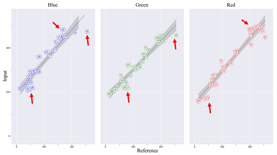 Comparison of the R, G, B color values of various color chips from the color checker between an input image and the reference image. Note: The red arrows point to sample problematic chips in the input image deviate from the linear trend line.