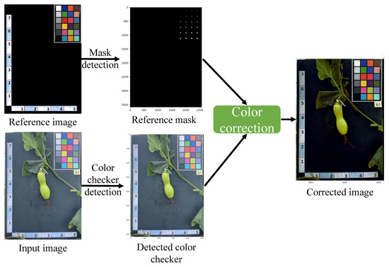 The conventional approach for color correction involves selecting a reference image with known color values, which serves as the basis for calculating the color correction matrix [30]. This matrix is then applied to other images, modifying their color channels. By performing matrix multiplication on the red, green, blue (RGB) color channels of the input image using the estimated color correction matrix, the color balance of the image is adjusted to match that of the reference image. This alignment enhances the precision of color representation, providing a more accurate depiction of the actual plant colors. This level of color accuracy is particularly valuable in plant phenotyping applications. The color correction equation can be described as follows: