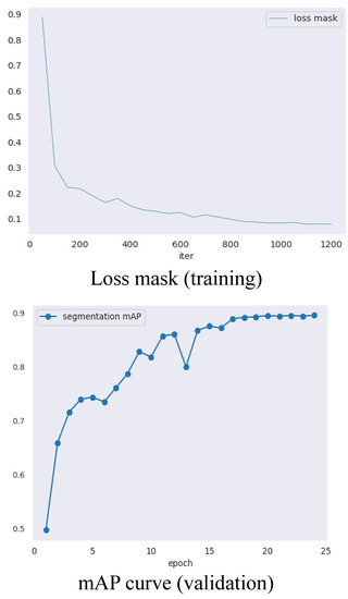 The SOLOv2-based model used a pre-trained ResNet-101, which was initially trained on the ImageNet dataset [45], as its backbone. During training, the model was specifically configured to detect two classes: fruit and vine. The intermediate feature maps, consisting of 512 channels, were utilized for generating precise object masks. The mask head of the SOLOv2 model incorporated four convolutional layers to refine the mask predictions. To optimize the model’s performance in generating accurate object masks, the dice loss function was employed as the primary loss function during the training process. The model was trained for 25 epochs with an Adam optimizer, using an initial learning rate of and weight decay of . The mini-batch size was set to 4.