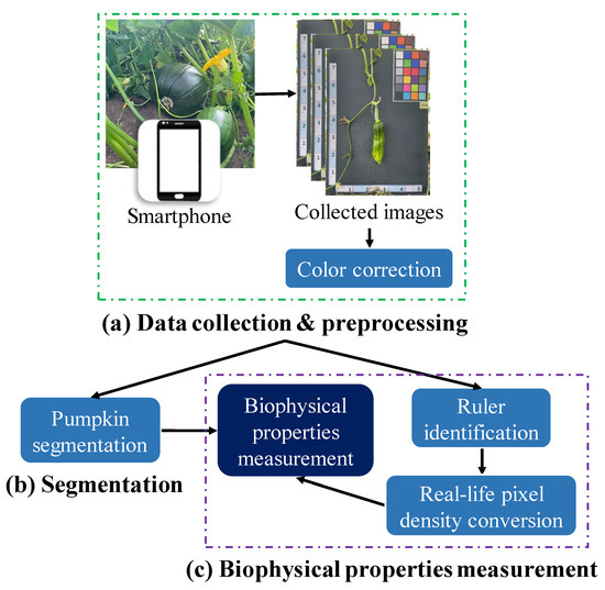 Illustration of the proposed biophysical properties measurement framework for pumpkin images collected by hand-held devices.