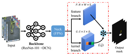 The SOLOv2 model is considered a state-of-the-art instance segmentation model [31], which is capable of detecting and segmenting multiple objects within an image. Unlike other segmentation models that only predict bounding boxes, SOLOv2 goes a step further by providing pixel-wise instance masks for each object [29]. This unique characteristic makes it a powerful tool with various applications in CV [32,33]. The choice of the SOLOv2 algorithm for pumpkin recognition in this study was driven by its distinct capabilities in precise object segmentation with fast inference speed [34]. This characteristic makes it particularly suitable for our goal of accurately segmenting the different components of pumpkins, namely the vines and fruits. The architecture of the SOLOv2 model is depicted in Figure 7.