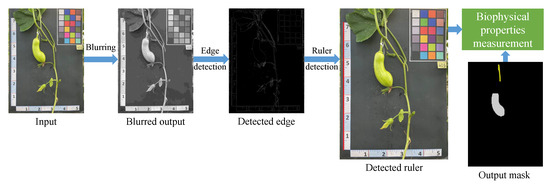 This section presents an automated pipeline designed to accurately measure the physiological properties of various components of pumpkins by detecting the ruler placed alongside the pumpkins in the captured images. The biophysical properties of both the pumpkin fruit and vine were analyzed using a set of one qualitative and four quantitative parameters, adhering to the guidelines provided by the International Union for the Protection of New Varieties of Plants (UPOV, 2021) [37]. The process involves a series of CV operations, as depicted in Figure 8, which includes ruler detection, pixel density conversion, and actual measurement calculation.