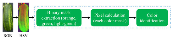 - Color estimation: The estimation of the pumpkin’s FPC was based on the standard color variations observed in pumpkins. According to findings of Kaur et al. [1], the color of the pumpkin fruit peel can exhibit variations based on factors such as the pumpkin variety and maturity stage. Typically, pumpkin fruit peel is characterized by an orange hue, which can range from a pale, light orange to a deep, rich shade. Additionally, certain pumpkin varieties may feature green, yellow, or white stripes or patches on their peel. As the pumpkin undergoes ripening, the peel color tends to deepen and become more vibrant. Hence, this study focused on three main FPC categories: orange, green, and light green.Figure 10 visually presents the process of classifying pumpkin’s FPC using the hue, saturation, and value (HSV) color space. The HSV color space is favored over RGB for color detection tasks due to its ability to separate color information from brightness or luminance information, thereby providing a more intuitive representation [42]. In this process, specific color ranges within the HSV color space were defined, enabling the creation of binary masks for each color range. These binary masks were then employed to determine the FPC by identifying the color range with the highest pixel count.