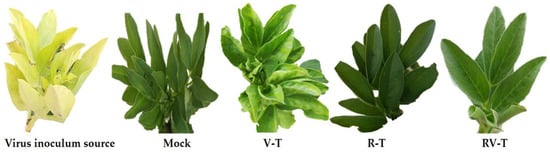 Effect of soil application of R. leguminosarum bv. viciae strain 33504-Mat209 on developing disease symptoms in faba bean leaves at 16 dpi. The virus inoculation source showed a clear calico characteristic symptom of AMV infection; Mock: healthy control; V-T: faba bean inoculated with AMV only; R-T: faba bean inoculated with 33504-Mat209 only; RV-T: faba bean treated with 33504-Mat209 and then inoculated with AMV.