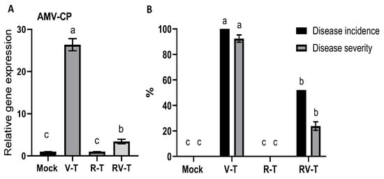 The relative accumulation of AMV coat protein (AMV-CP) is represented in (A) with associated disease incidence % and disease severity % (B) in healthy control (Mock), AMV-infected (V-T), healthy plant-Rhizobium treated (R-T), and AMV-infected-treated with Rhizobium (RV-T). Statistical significance was indicated alphabetically in each column in ascending order, whereas a > b > c.