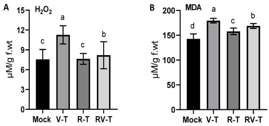 Oxidative stress biomarkers were evaluated in faba bean plants under AMV challenge, including H2O2 accumulation (A) and MDA level (B) in healthy control (Mock), AMV-infected (V-T), health plant-Rhizobium treated (R-T), and AMV-infected-treated with Rhizobium (RV-T). Statistical significance was indicated alphabetically above each histogram in ascending order, whereas a > b > c > d.