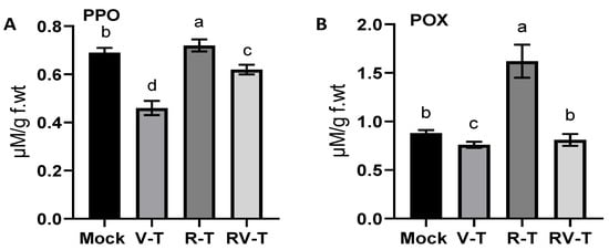 Furthermore, the PPO activity was also evaluated in all groups. As shown in Figure 4B, the PPO level was significantly reduced in V-T to 0.46 ± 0.01 µM/g. f.wt, which represents about a 50% reduction from the enzyme level in Mock plants (0.69 ± 0.02 µM/g. f.wt). Treatment with 33504-Mat209 enhanced the PPO level in the R-T group to 0.72 ± 0.01 µM/g. f.wt (about 4%) compared to Mock plants, whereas in RV-T, the PPO level was 0.62 ± 0.02 µM/g. f.wt. However, the PPO level was lower in RV-T compared to Mock plants. The 33504-Mat209 treatment succeeded in enhancing enzyme levels by about 56.5% compared to the V-T group (Figure 4B).