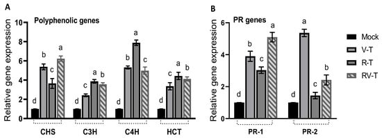 (A) the relative expression of polyphenolic genes (CHS, C3H, C4H, and HCT) and (B) pathogenesis-related genes (PR-1 and PR-2) of healthy control (Mock), AMV-infected (V-T), healthy plant-Rhizobium treated (R-T), and AMV-infected-treated with Rhizobium (RV-T). Differences between groups were determined using a one-way analysis of variance (ANOVA) and Tukey’s HSD test at the p ≤ 0.05 significance level in the CoStat statistical package. Statistical significance was indicated alphabetically above the histogram in ascending order, whereas a > b > c > d.