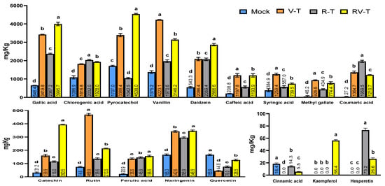 The variation in polyphenolic compound concentration (mg/kg) in the healthy plants (Mock), AMV-infected (V-T), healthy plant-Rhizobium treated (R-T), and AMV-infected-treated with Rhizobium (RV-T) as evaluated through high-performance liquid chromatography (HPLC) analysis. Differences between groups were determined using a one-way analysis of variance (ANOVA) and Tukey’s HSD test at the p ≤ 0.05 significance level in the CoStat statistical package. Statistical significance was indicated alphabetically above the histogram in ascending order, whereas a > b > c > d.