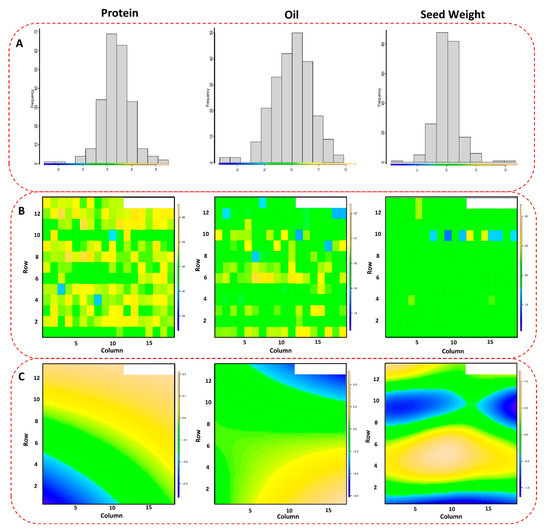 The phenotypic evaluations and collecting process of the soybean yield for the tested panel are explained in detail in [21]. After adjusting the phenotypic plots for each genotype based on spatial analysis, the tested GWAS panel showed significant variations for seed protein, oil, and 100-seed weight across four tested environments (Figure 1A–C). The 100-seed weight had the highest spatial variation in the field, followed by seed protein and seed oil (Figure 1C). The maximum and minimum values for 100-seed weight were 36.49 g and 7.61 g, respectively, with an average of 18.68 g. Seed protein had an average of 39.90% in the tested GWAS panel with maximum and minimum values of 48.77% and 14.51%, respectively. Soybean seed oil also had the maximum and minimum values of 23.37% and 16.61% in the tested GWAS panel, respectively, with an average of 20.03%. Among all the tested traits, seed protein had the highest heritability, with an estimated value of 0.69, followed by seed oil and 100-seed weight with values of 0.67 and 0.60, respectively.