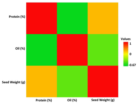 The linear correlation coefficients (r) estimated among yield and the target seed traits revealed a significant negative correlation (−0.67) between seed protein and oil concentrations (Figure 2). In addition, 100-seed weight was negatively correlated with seed oil, with a value of r = −0.33 (Figure 2). While seed yield had positive correlations with 100-seed weight (r = 0.69) and protein concentration (r = 0.15), it showed a negative correlation with oil concentration (r = −0.10). However, the correlations between seed yield and protein as well as seed yield and oil concentration were not significant (α = 0.05).