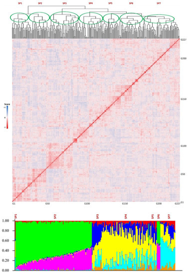 Kinship (top) and structure (bottom) plots for the tested GWAS panel. The x-axis is the number of genotypes used in this GWAS panel, and the y-axis is the membership of each subgroup. SP1-SP7 stands for the seven subpopulations.