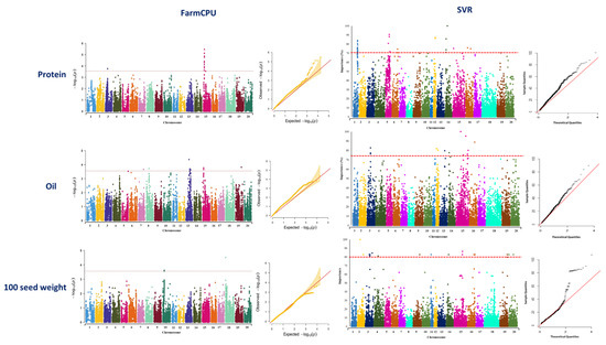Manhattan and quantile–quantile plots showcasing the results of GWAS studies on soybean seed protein, oil, and 100-seed weight. The plots were generated using two different methods: FarmCPU and SVR. The plots are arranged in a left-to-right sequence, with FarmCPU results displayed first, followed by SVR results.