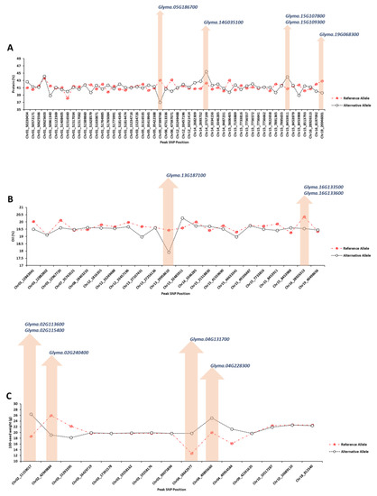 Considering the 150 kbp upstream and downstream flanking regions for each peak SNP with high allelic effect, the potential candidate genes were identified using gene annotation, previous studies, and enrichment tools. For seed protein concentration, four peak SNPs (Chr05_37399766, Chr14_2757199, Chr15_8453911, and Chr19_20046001) had the highest allelic effect compared to other identified peak SNPs (Figure 5A). Five candidate genes, Glyma.05G186700 (GO:0006865), Glyma.14G035100 (GO:0009888), Glyma.15G107800 (GO:0016926), Glyma.15G109300 (GO:0009658), and Glyma.19G068300 (GO:0010099), were detected as the strong candidate genes governing seed protein, which encode amino acid transport, tissue development, protein desumoylation, chloroplast organization, and regulation of photomorphogenesis, respectively (Figure 5). For soybean seed oil, two peak SNPs, Chr13_29958610 and Chr16_28926313, had the highest allelic effect compared to other detected peak SNPs (Figure 5B). Based on the gene annotation and expression within QTL, Glyma.13G187100 (GO:0008168), Glyma.16G133500 (GO:0009697), and Glyma.16G133600 (GO:0016887) were identified as the strong candidate genes underlying soybean seed oil, which encode methyltransferase activity, salicylic acid biosynthetic process, and ATPase activity, respectively (Figure 5B). The peak SNPs of Chr02_11159017, Chr02_42949884, Chr04_18642977, and Chr04_49895660 had the highest allelic effect for 100-seed weight among all the identified peak SNP (Figure 5C). The candidate genes of Glyma.02G113600 (GO:0042631), Glyma.02G115400 (GO:0006007), Glyma.02G240400 (GO:0005986), Glyma.04G131700 (GO:0010182), and Glyma.04G228300 (GO:0005982) were selected as the strong candidate genes associated with 100-seed weight, which encode cellular response to water deprivation, glucose catabolic process, sucrose biosynthetic process, sugar mediated signaling pathway, and starch metabolic process, respectively (Figure 5C).