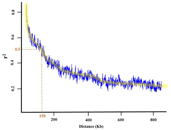 Out of 250 soybean genotypes, 23 of them were eliminated because of the high level of missing data, and a total of 17,958 high-quality SNPs were archived from a total of 40,712 SNPs from 227 soybean genotypes and mapped on 20 soybean chromosomes. For the tested association panel, pairwise linkage disequilibrium (LD) between SNPs was calculated based on the correlation coefficient (R2) of alleles using 17,958 high-quality SNPs. The minimum number of SNPs (403) was found on chromosome 11, and the maximum number of SNPs (1780) was found on chromosome 18. The average number of SNPs across all the 20 soybean chromosomes was 898, with a mean density of 0.12 cM for every single SNP across the genome.