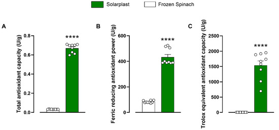 Solarplast® had significantly higher total antioxidant activity than frozen spinach extracts. Total antioxidant activity was measured using (A) Trolox (TOC), (B) ferric reducing (FRAP) and (C) total antioxidant capacity (TEAC). Bars indicate average concentration (n = 9) ± SEM. Significantly higher than frozen spinach, **** p < 0.0001.