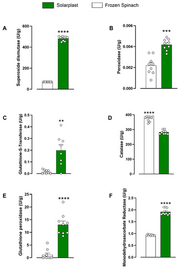 Solarplast® had significantly higher levels of antioxidant enzymes compared to frozen spinach except for catalase. (A) Superoxide dismutase, (B) peroxidase, (C) glutathione-S-transferase, (D) catalase, (E) glutathione peroxidase and (F) monodehydroascorbate reductase. Results show average (n = 6) ± SEM. ** p < 0.01, *** p < 0.001 and **** p < 0.0001 indicate significantly higher concentrations.