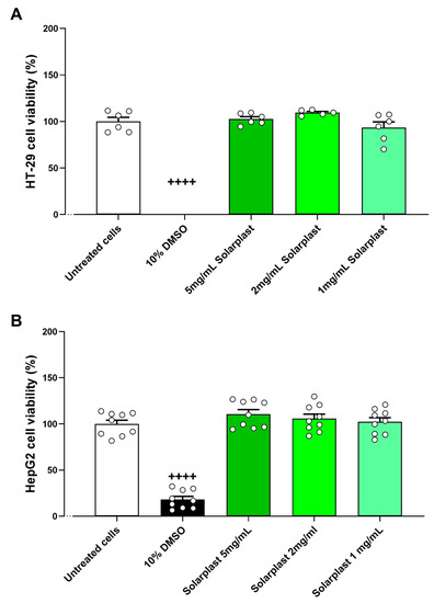 Solarplast® extracts were not cytotoxic in intestinal HT-29 and liver HepG2 cell lines. (A) Solarplast® was not cytotoxic in HT-29 cell line. Results show average survival (n = 6) ± SEM. (B) Solarplast® was not cytotoxic in HepG2 cell line. Results show average survival (n = 9) ± SEM. ++++ p < 0.0001 significantly higher than untreated cells.