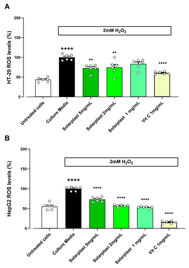 Hydrogen peroxide increased ROS levels as compared to untreated cells for HT-29 (Figure 4A, t(10) = 14.80, p < 0.001) and HepG2 (Figure 4B, t(10) = 11.18, p < 0.001) cell lines. Solarplast® significantly attenuated this hydrogen-peroxide-induced increase in ROS production in both HT-29 (Figure 4A, F(4, 20) = 13.82, p < 0.0001) and HepG2 (Figure 4A, F(4, 20) = 396.7, p < 0.0001) cell lines.