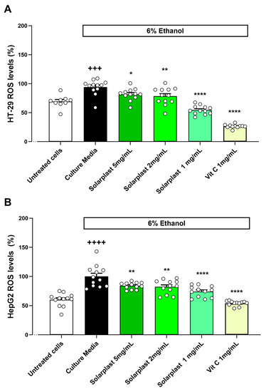 Solarplast® extracts reduced ROS levels in intestinal HT-29 and liver HepG2 cell lines exposed to 6% ethanol. (A) Solarplast® reduced ROS concentration in HT-29 cells exposed to ethanol. Results show average ROS production (n = 12) ± SEM. (B) Solarplast® reduced ROS concentration in HepG2 cells exposed to ethanol. Results show average ROS production (n = 12) ± SEM. All cells were exposed to 6% ethanol except for the untreated group. * p < 0.05, ** p < 0.01 and **** p < 0.0001 indicate significantly lower than control ethanol-exposed cells. +++ p < 0.001 and ++++ p < 0.0001 significantly higher than untreated cells.