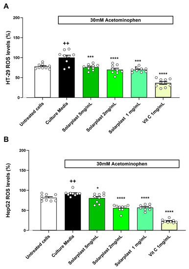Solarplast® extracts reduced ROS levels in intestinal HT-29 and liver HepG2 cell lines exposed to acetaminophen. (A) Solarplast® reduced ROS concentration in HT-29 cells exposed to acetaminophen. Results show average ROS production (n = 9) ± SEM. (B) Solarplast® reduced ROS concentration in HepG2 cells exposed to acetaminophen. Results show average ROS production (n = 9) ± SEM. All cells were exposed to 30 mM acetaminophen except for the untreated group. * p < 0.05, *** p < 0.0005 and **** p < 0.0001 indicate significantly lower than control acetaminophen-exposed cells. ++ p < 0.01 significantly higher than untreated cells.