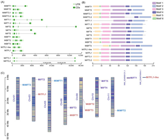 Most of the 13 PEBP family genes in M. integrifolia contain four exons and three introns except for MiMFT3 and MiFT3, both of which contain five exons and four introns. Among them, the MiFT3 gene is longer than the other genes, with a length of more than 65,000 bp (Figure 1A). A total of six conserved motifs were identified in the family of MiPEBP proteins. The motifs 1 to 5 were observed in almost all MiPEBP, and the sequences were consistent, indicating that MiPEBP genes are relatively conserved. Motif 6 was only present in some genes of the MFT-like and TFL1-like subfamilies but was not present in the FT-like subfamily (Figure 1B). In Figure 1C, the MiPEBP genes were mainly distributed on seven chromosomes, which were chromosomes 01, 03, 05, 06, 08, 10 and 11, respectively, and the distribution was uneven. Chromosomes 03, 06 and 08 contained two MiPEBP genes, while the remaining chromosomes contained only one gene for each. In addition, MiFTL1-like and MiFT1 genes were located on two unanchored scaffolds.