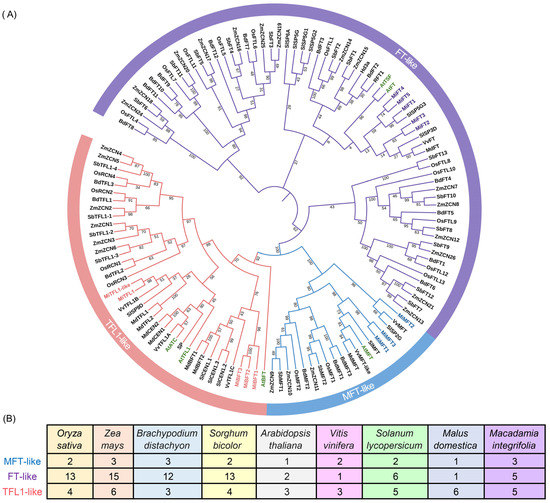 To investigate the relationships among the MiPEBP proteins, a phylogenetic tree was constructed via the neighbor joining method based on a multiple-sequence alignment of 126 sequences from Oryza sativa, Zea mays, Brachypodium distachyon, Sorghum bicolor, Arabidopsis thaliana, Vitis vinifera, Solanum lycopersicum, Malus domestica and Macadamia integrifolia. These 126 PEBP protein sequences were found to be classified into MFT-like, FT-like and TFL-like subfamilies (Figure 2A). Each species contains a different number of PEBP genes (Figure 2A). Compared to dicotyledonous plants, monocotyledonous plants exhibit higher numbers of PEBE genes (Figure 2B). In M. integrifolia, the MFT-like subfamily harbors three genes, including MiMFT1, MiMFT2 and MiMFT3. Five genes were clustered into the FT-like subfamily, which were MiFT1, MiFT2, MiFT3, MiFT4 and MiFT5. There were five genes including MiTFL1-like, MiTFL1, MiBFT1, MiBFT2s and MiBFT3 identified in the TFL-like subfamily (Figure 2A).
