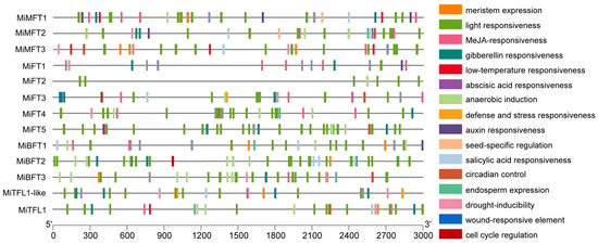 Cis-acting elements among the promoter regions of MiPEBP family members. The different colored boxes represent various cis-acting elements located in the promoter regions of MiPEBP members.