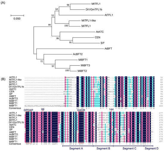 Identification and multiple alignment analysis of TFL1 proteins. (A) Phylogenetic relationship of the TFL1 subfamily. (B) Multiple sequence alignment analysis between MiTFL1 proteins and other TFL1 homologues.