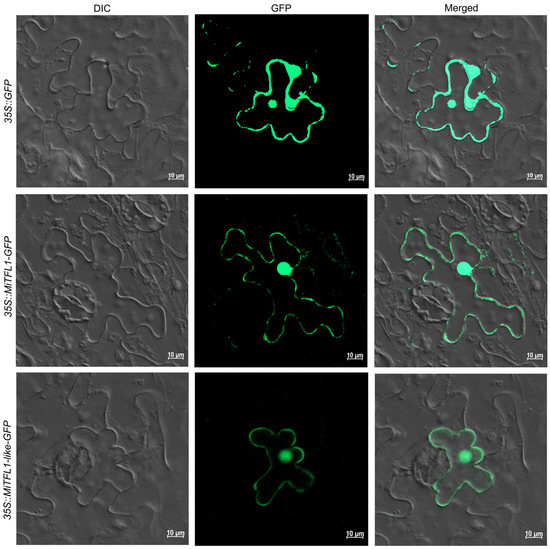 To detect the subcellular localizations of MiTFL1 and MiTFL1-like, 35S::MiTFL1-GFP and 35S::MiTFL1-like-GFP fusion plasmids were constructed and transiently expressed in tobacco leaves. The GFP signals of MiTFL1and MiTFL1-like were distributed in both the nucleus and cytoplasm and were detected via confocal microscopy. The green fluorescent protein of the control group was distributed in the nucleus and the cytoplasm (Figure 5). These results suggest that both MiTFL1 and MiTFL1-like proteins are localized in the cytoplasm and nucleus to function.