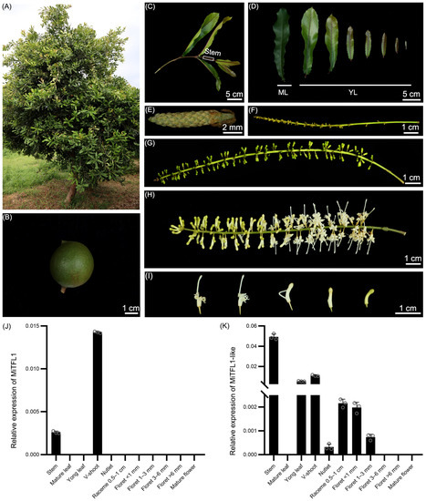 Morphologies of different organs and expression patterns of MiTFL1 and MiTFL1-like in different tissues of M. integrifolia. (A) A ten-year-old M. integrifolia tree. (B) A mature M. integrifolia nut. (C) A branch of M. integrifolia tree containing a vegetative shoot (V-shoot) and a young stem. (D) The leaves at different development stages of M. integrifolia. ML—mature leaf; YL—young leaf. (E) Raceme, about 1 cm. (F–H) Racemes of different lengths with florets in different periods. (I) Florets in different periods, collected from different part of racemes. (J) Relative expression of MiTFL1. (K) Relative expression of MiTFL1-like.