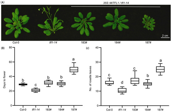 The flowering time analysis of transgenic Arabidopsis. (A) The phenotypes of MiTFL1 transgenic lines 10 days post anthesis for tfl1–14. (B) The days to flower and (C) the number of rosette leaves. Data were collected at bolting time with 15 plants per line (Tables S3 and S4). In (B,C), a, b, c, d, different letters indicate statistically significant differences between each other. The comparison was conducted via a one-way analysis of variance (ANOVA), and a significance level of p < 0.05 was considered as statistically significant.
